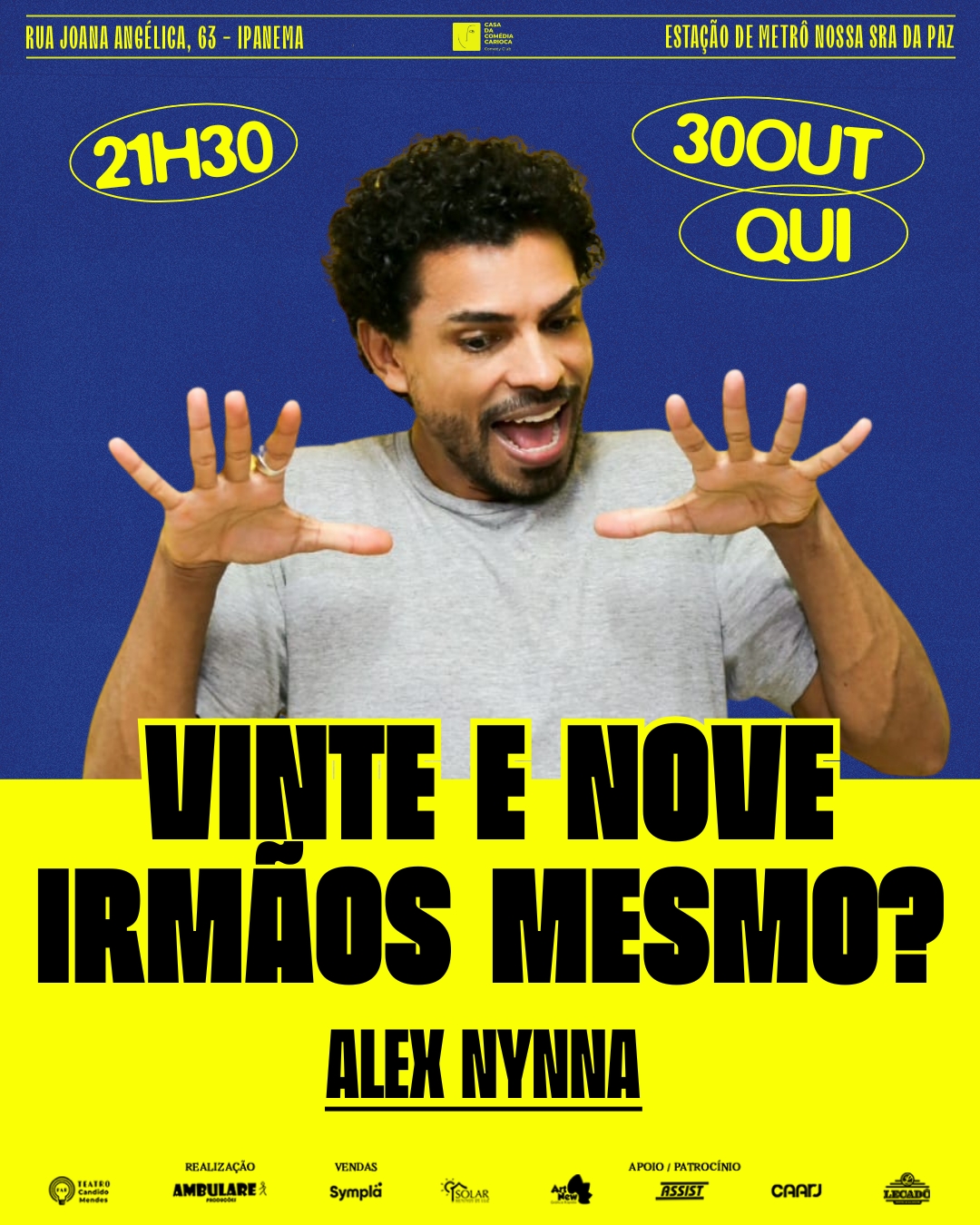 O ator e comediante Alex Nynna apresenta o espetáculo solo de Stand Up Comedy “Vinte Nove Irmãos Mesmo?”,no dia 30 de Outubro na Casa da Comédia Carioca , Rua Joana Angélica 63 – Zona Sul do Rio de Janeiro.