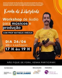 No próximo dia 26 de junho, das 17h às 19h, vai se realizar o Workshop de Áudio para Músicos e Produção, com o Ministrante Professor e técnico de som Matheus Vinícius, promovido pelo Meu Kantinho Centro de Cultura. O evento será realizado na Rua Indígena, 62 – Penha, Rio de Janeiro, com classificação livre e entrada gratuita.