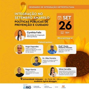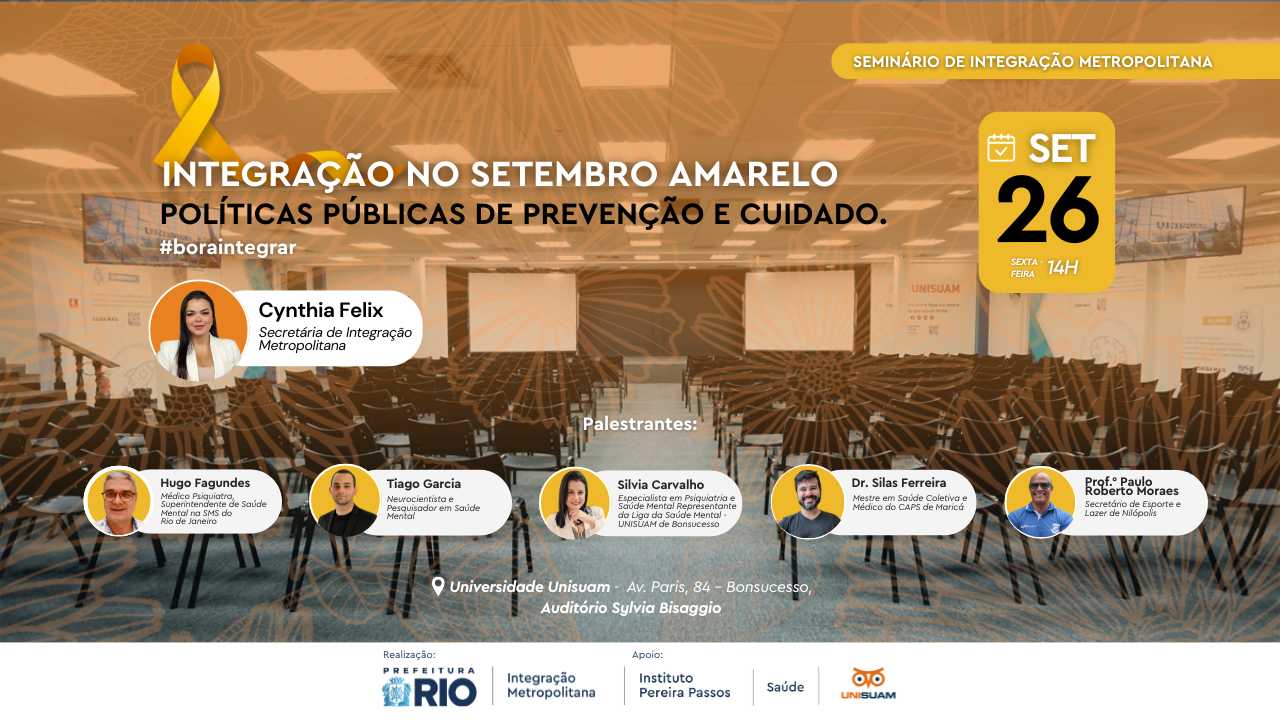 A Prefeitura do RJ, através da Secretaria Especial de Integração Metropolitana  – SEIM, promove na próxima sexta feira, (26/09) de 14h às 17h. , o   “Setembro Amarelo: Políticas Públicas de Prevenção e Cuidado” para debater políticas de promoção da saúde mental e valorização da vida. Tema de utilidade pública.